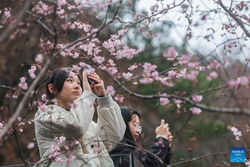 A tourist takes photos of the wild cherry flowers at Qianyuan Village of Sandu Town, Jiande City of east China's Zhejiang Province, on Feb. 25, 2026. Flowers of wild cherry trees which cover a large area in Sandu Town are in full bloom currently, attracting swarms of tourists. (Xinhua/Xu Yu)