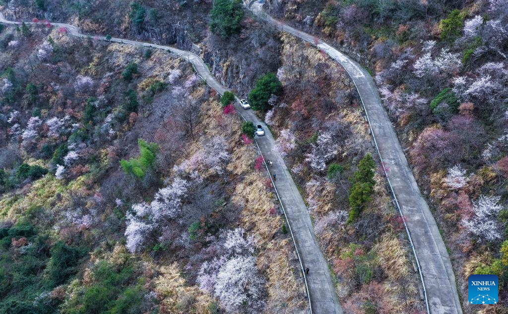 This photo taken on Feb. 25, 2026 shows a view of the wild cherry flowers at Sandu Town of Jiande City, east China's Zhejiang Province. Flowers of wild cherry trees which cover a large area in Sandu Town are in full bloom currently, attracting swarms of tourists. (Xinhua/Xu Yu)