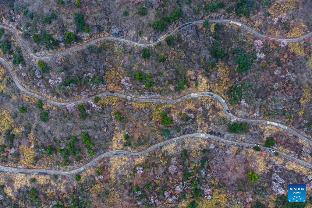 A drone photo taken on Feb. 25, 2026 shows a view of the wild cherry flowers at Sandu Town of Jiande City, east China's Zhejiang Province. Flowers of wild cherry trees which cover a large area in Sandu Town are in full bloom currently, attracting swarms of tourists. (Xinhua/Xu Yu)