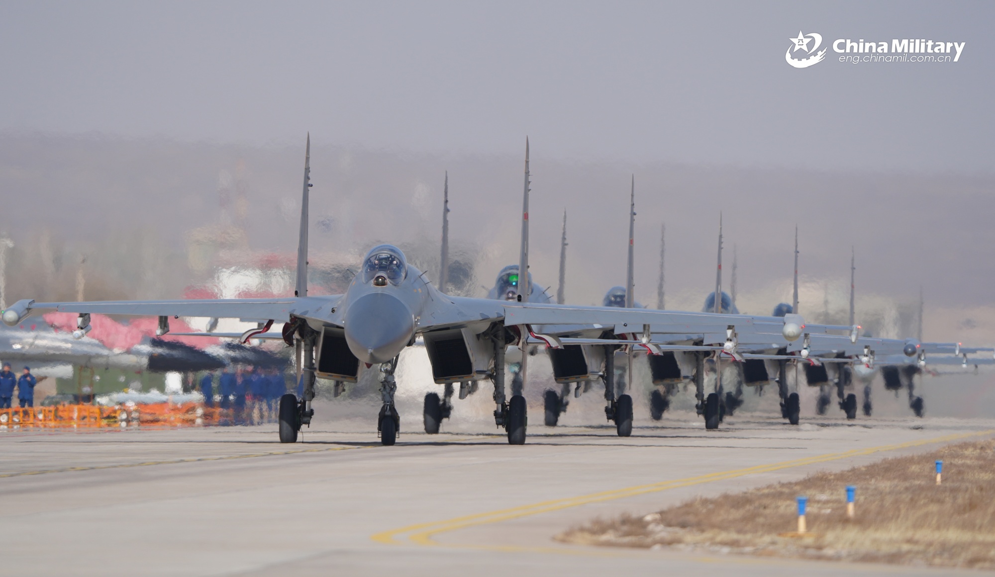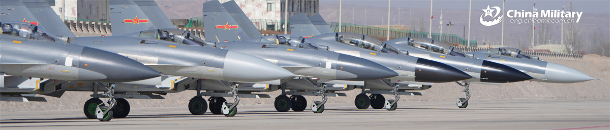 J-11 fighter jets attached to a unit with the air force under the Chinese PLA Western Theater Command wait for signal to take off for a flight training exercise on February 11, 2026. (eng.chinamil.com.cn/Photo by Yu Zeqi)