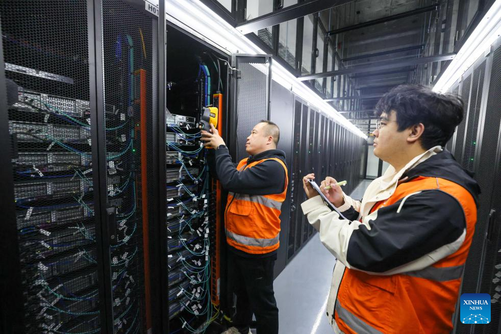 An engineer conducts an inspection of the intelligent computing servers at an intelligent computing center of China Telecom at the Beijing-Tianjin Industrial New City Gaocun Data Intelligence Innovation Park in north China's Tianjin, Feb. 26, 2026. The Beijing-Tianjin Industrial New City Gaocun Data Intelligence Innovation Park is a pivotal platform for fostering the digital economy in Tianjin's Wuqing District. The park boasts six high-level data centers in operation and is home to over 300 data-driven enterprises. It delivers efficient, low-latency, real-time computing services to support businesses across the Beijing-Tianjin-Hebei region in sectors including finance, digital creativity, rail transit, and healthcare. Its computing service capabilities maintain a leading position in the region. (Xinhua/Sun Fanyue)