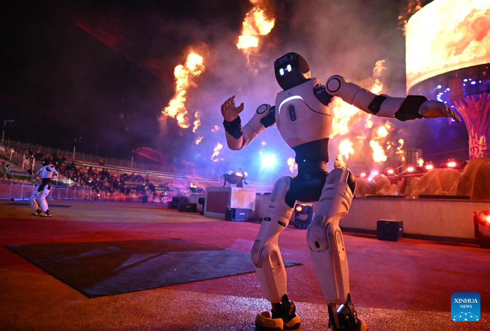 A humanoid robot performs during a myth-themed live-action show at a scenic area in Qingdao, east China's Shandong Province, on Feb. 26, 2026. (Xinhua/Li Ziheng)