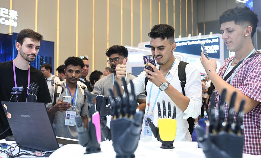 Foreign purchasers interact with robotic hands at the Service Robots Zone during the 138th edition of the China Import and Export Fair (Canton Fair) in Guangzhou, south China's Guangdong Province, Oct. 15, 2025. (Xinhua/Deng Hua)