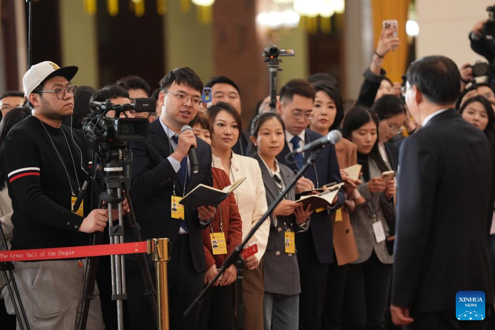 A journalist asks a question during an interview attended by ministers after the opening meeting of the fourth session of the 14th National People's Congress (NPC) at the Great Hall of the People in Beijing, capital of China, March 5, 2026. (Xinhua/Wang Xi)
