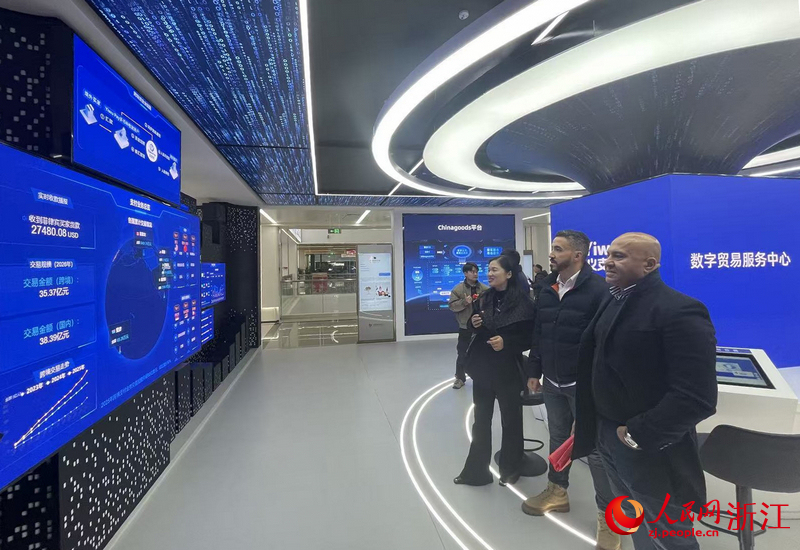 Foreign businesspeople view data on the global expansion of the Yiwu International Trade Market in Yiwu, east China's Zhejiang Province. (People's Daily Online/Wang Liwei)
