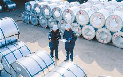 Customs officers with Tianjin Customs in north China's Tianjin Municipality inspect a batch of steel coils produced in north China's Hebei Province before they are loaded onto a vessel for export at Tianjin Port. (Photo/Peng Xiaoyi)
