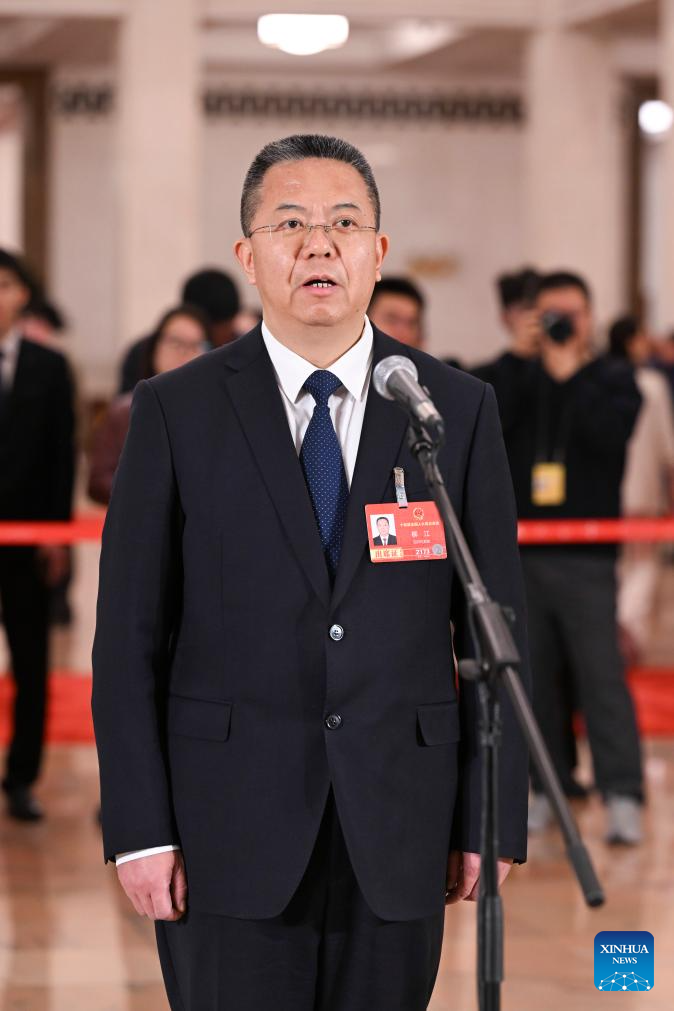 Liu Jiang, a deputy to the 14th National People's Congress (NPC), attends a group interview ahead of the second plenary meeting of the fourth session of the 14th NPC at the Great Hall of the People in Beijing, capital of China, March 9, 2026. (Xinhua/Cheng Tingting)