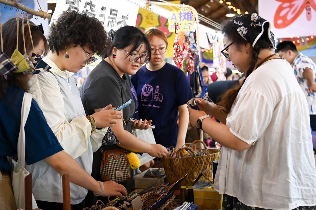 Tourists purchase products at a second-hand market of the Xicang Urban Memories Park in Lianhu District of Xi'an, northwest China's Shaanxi Province, July 5, 2025. (Xinhua/Zou Jingyi)