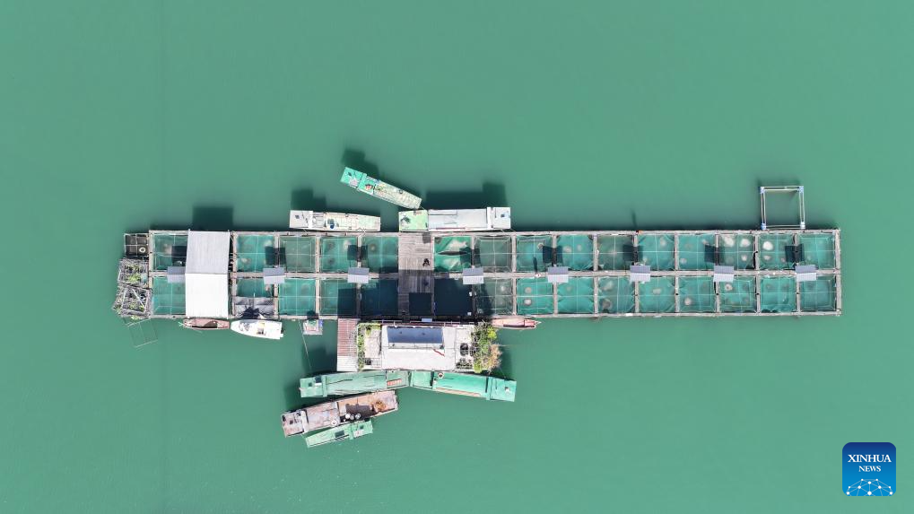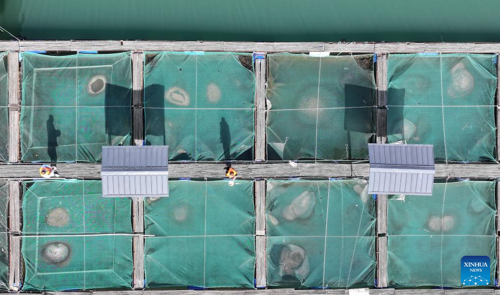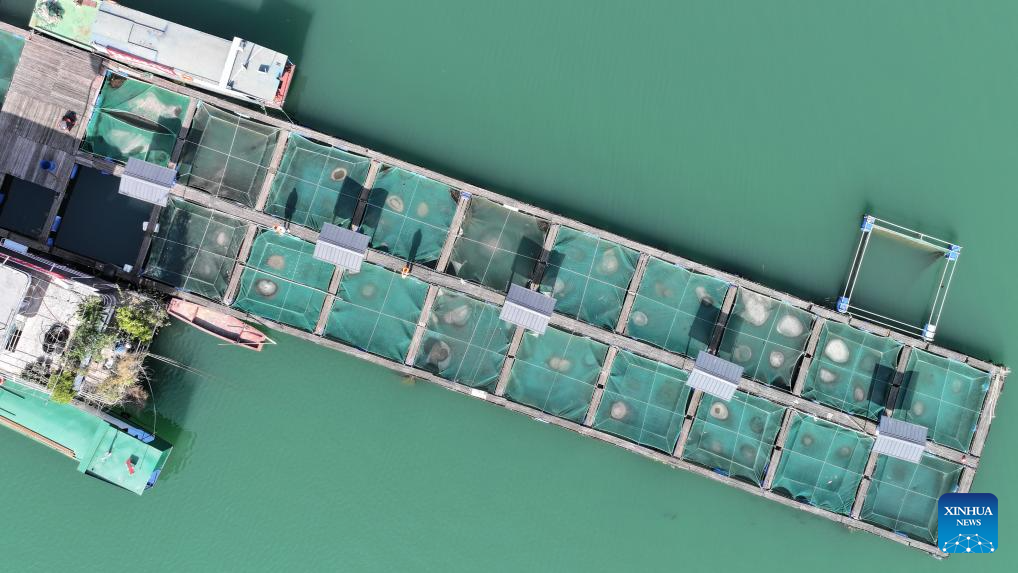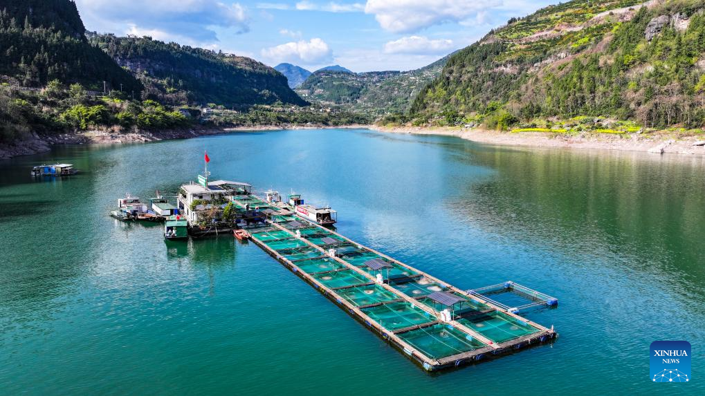 An aerial drone photo taken on March 9, 2026 shows staff members feeding the fish at the Dazhou base of the fisheries research institute of Wanzhou District, southwest China's Chongqing.