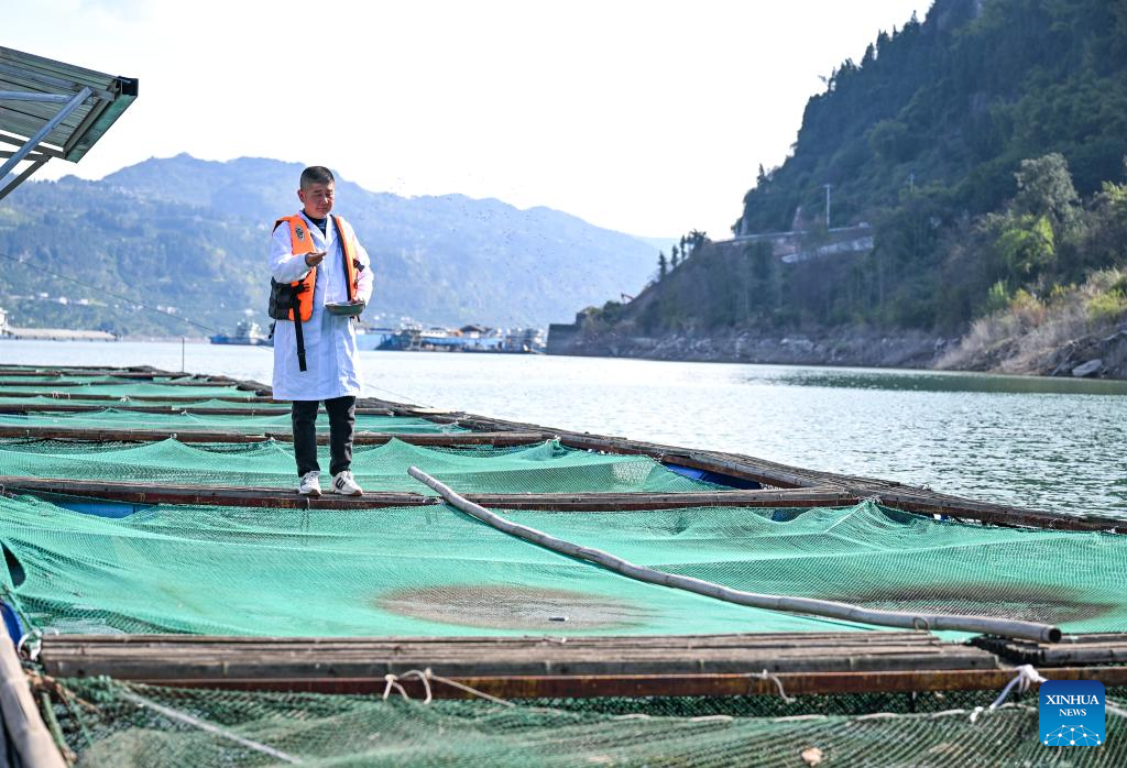 Staff members check the growth of the fish at the Dazhou base of the fisheries research institute of Wanzhou District, southwest China's Chongqing, March 9, 2026.
