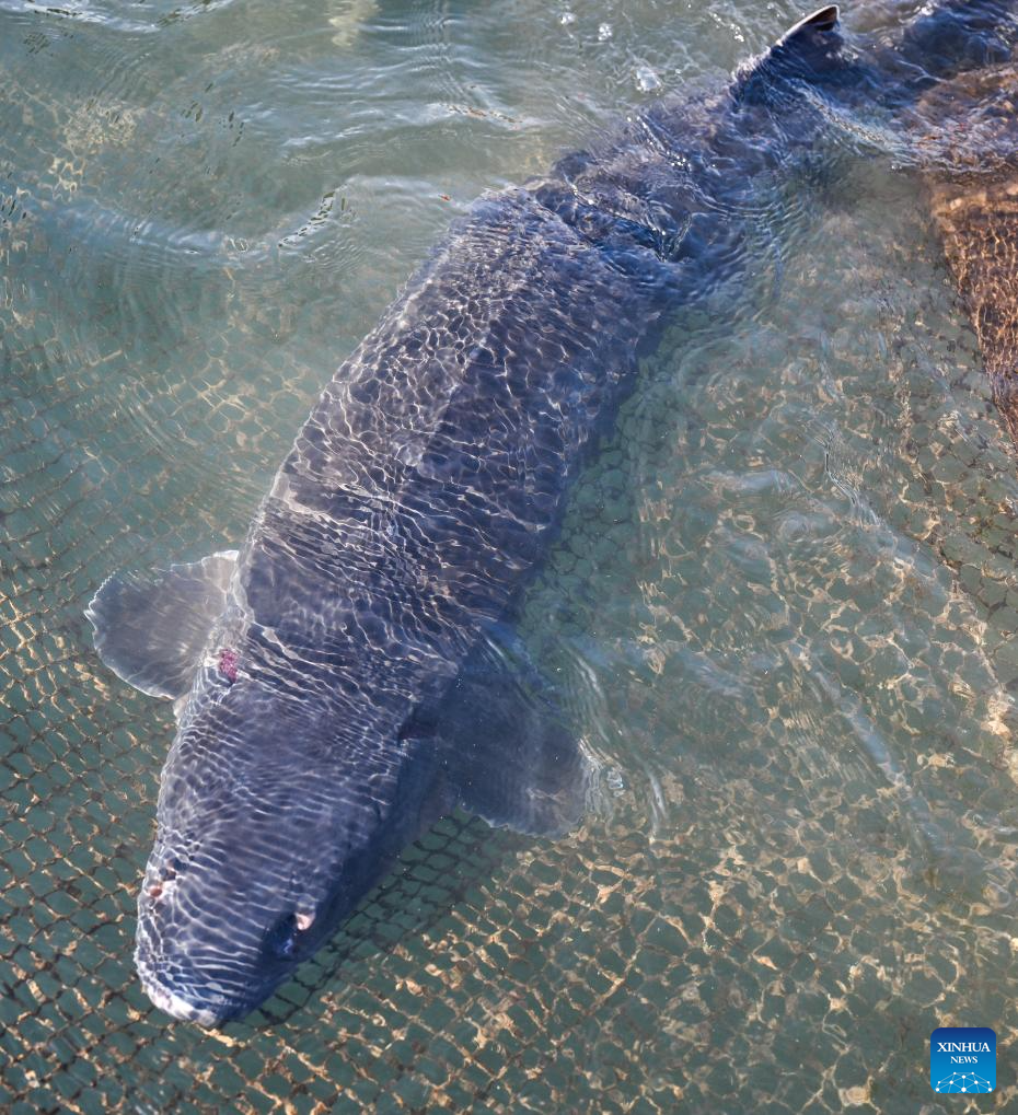 This photo taken on March 9, 2026 shows a Yangtze sturgeon at the Dazhou base of the fisheries research institute of Wanzhou District, southwest China's Chongqing.