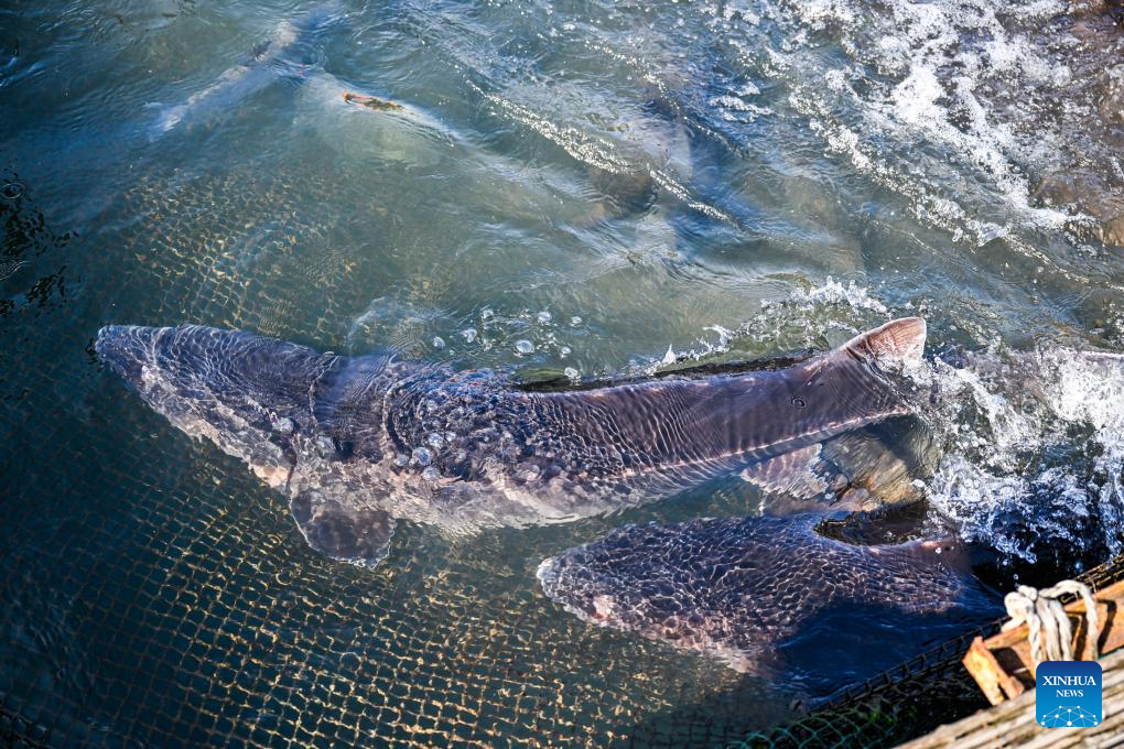 This photo taken on March 9, 2026 shows the Yangtze sturgeons at the Dazhou base of the fisheries research institute of Wanzhou District, southwest China's Chongqing.