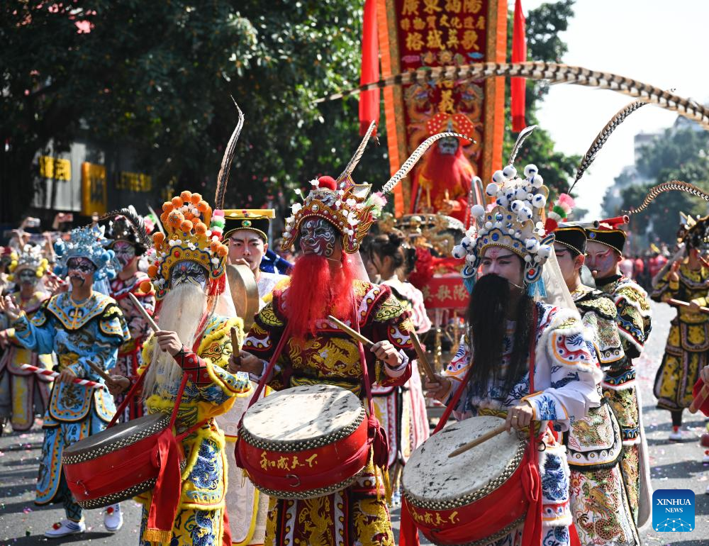 Parade performers interact with the audience during the Chenghuang temple fair in Jieyang, south China's Guangdong Province, March 11, 2026. The Chenghuang temple fair, held on the 23rd day of the first month on the traditional Chinese calendar, is one of the major traditional folk cultural events in Jieyang. (Photo by Huang Guangping/Xinhua)