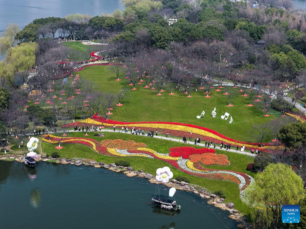 Tourists view flowers by Guazhu lake in Shaoxing, east China's Zhejiang Province, March 13, 2026. (Xinhua/Xu Yu)