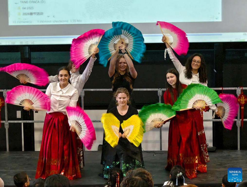 Students of the Provence-Alpes-Cote d'Azur International School perform during a Spring Festival activity in Manosque, France, Feb. 5, 2026. Chinese President Xi Jinping recently replied to a letter from teachers and students of the Chinese language class at the Provence-Alpes-Cote d'Azur International School in France, extending his best wishes to them as well as all the teachers and students of the school. (Xinhua)