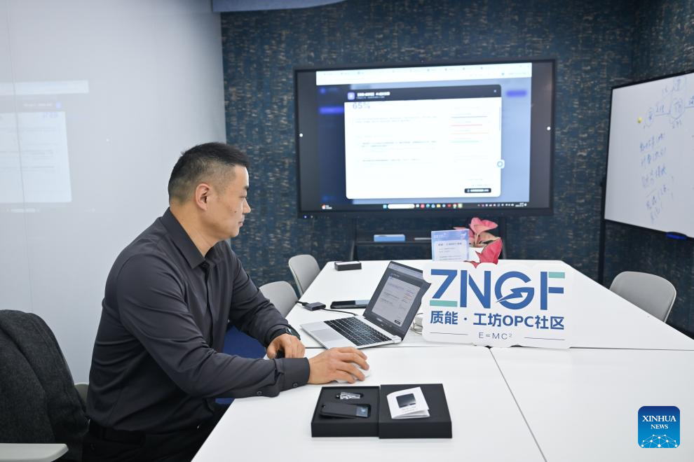 Wang Lei, founder of a tech startup, introduces his self-developed products at a one-person-company (OPC) community in Nanjing, east China's Jiangsu Province, March 11, 2026. (Xinhua/Ji Chunpeng)