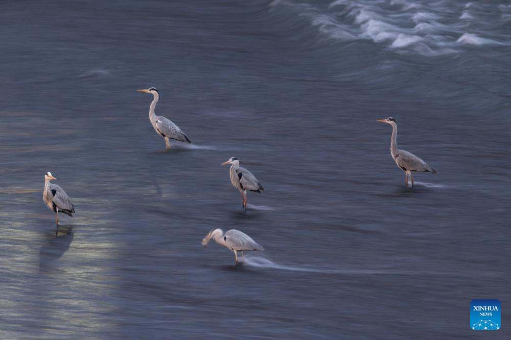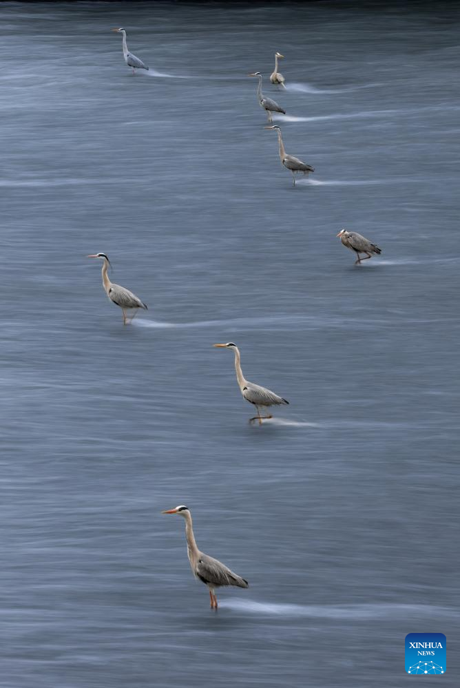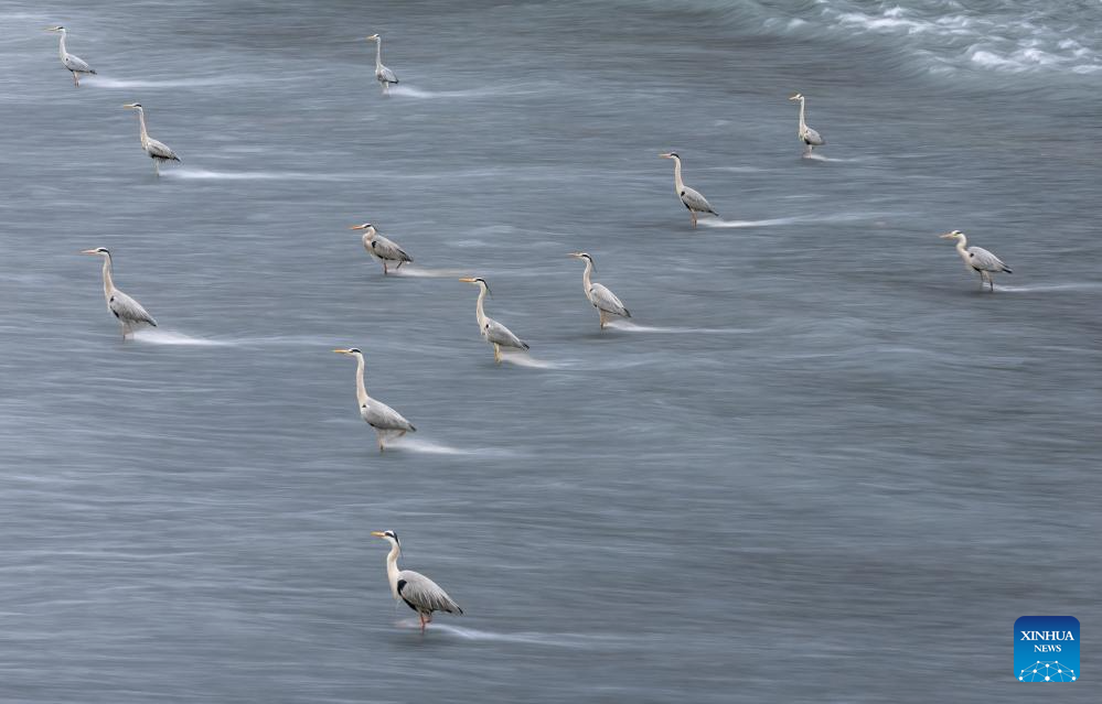 Herons forage in the Jinjiang River in Chengdu, southwest China's Sichuan Province, March 17, 2026. A large number of herons recently stood in rows against the current for a long time to forage in the Jinjiang River, attracting many citizens to watch and take pictures. (Xinhua/Jiang Hongjing)