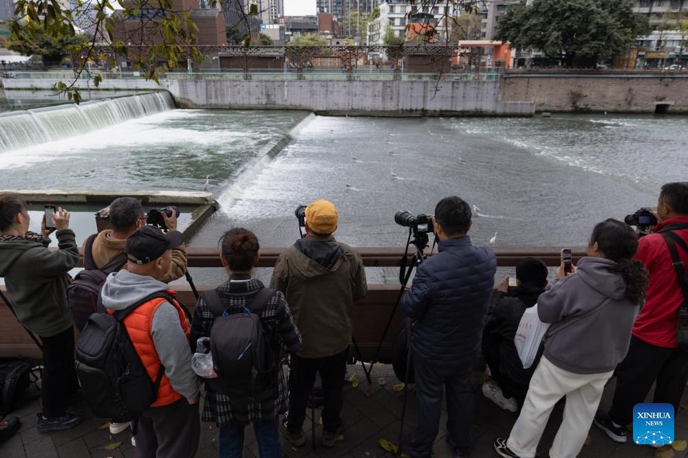 Citizens take photos of herons foraging in the Jinjiang River in Chengdu, southwest China's Sichuan Province, March 17, 2026. A large number of herons recently stood in rows against the current for a long time to forage in the Jinjiang River, attracting many citizens to watch and take pictures. (Xinhua/Jiang Hongjing)