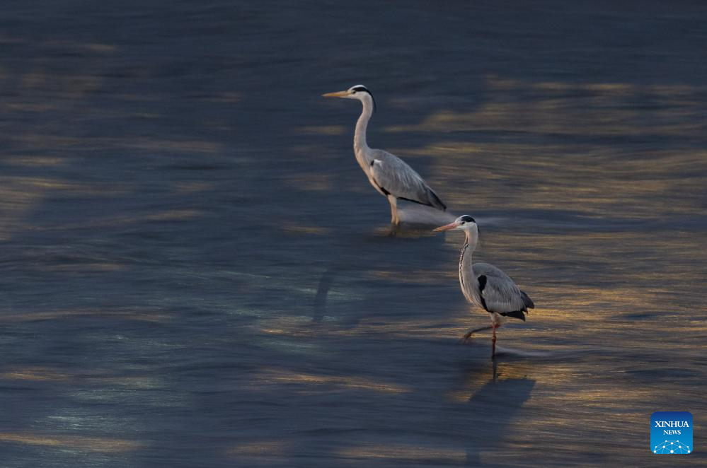 Two herons forage in the Jinjiang River in Chengdu, southwest China's Sichuan Province, March 17, 2026. A large number of herons recently stood in rows against the current for a long time to forage in the Jinjiang River, attracting many citizens to watch and take pictures. (Xinhua/Jiang Hongjing)