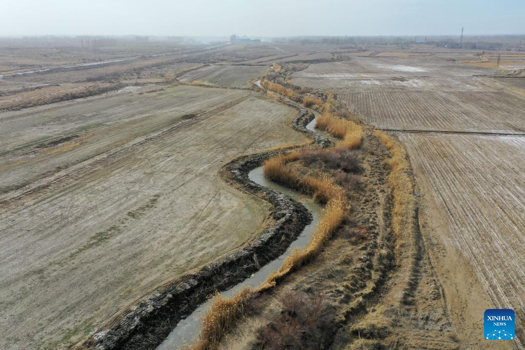 An aerial drone photo taken on March 24, 2026 shows a dredged river channel in Qapqal Xibe Autonomous County of Ili Kazak Autonomous Prefecture, northwest China's Xinjiang Uygur Autonomous Region. Recently, in response to the potential flood risks caused by snowmelt in the Tianshan and Altay Mountains, local authorities in Ili have conducted thorough hazard identification and rectification, increased the frequency of meteorological and hydrological monitoring, stockpiled sufficient flood control supplies, and established emergency rescue teams to prevent flood-related disasters during the flood season. (Xinhua/Ding Lei)