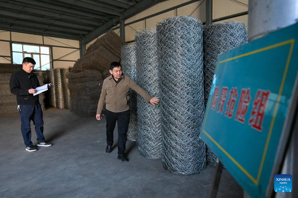 Staff members check supplies at a warehouse for flood control and drought relief emergency supplies in Xinyuan County of Ili Kazak Autonomous Prefecture, northwest China's Xinjiang Uygur Autonomous Region, March 27, 2026. Recently, in response to the potential flood risks caused by snowmelt in the Tianshan and Altay Mountains, local authorities in Ili have conducted thorough hazard identification and rectification, increased the frequency of meteorological and hydrological monitoring, stockpiled sufficient flood control supplies, and established emergency rescue teams to prevent flood-related disasters during the flood season. (Xinhua/Ding Lei)