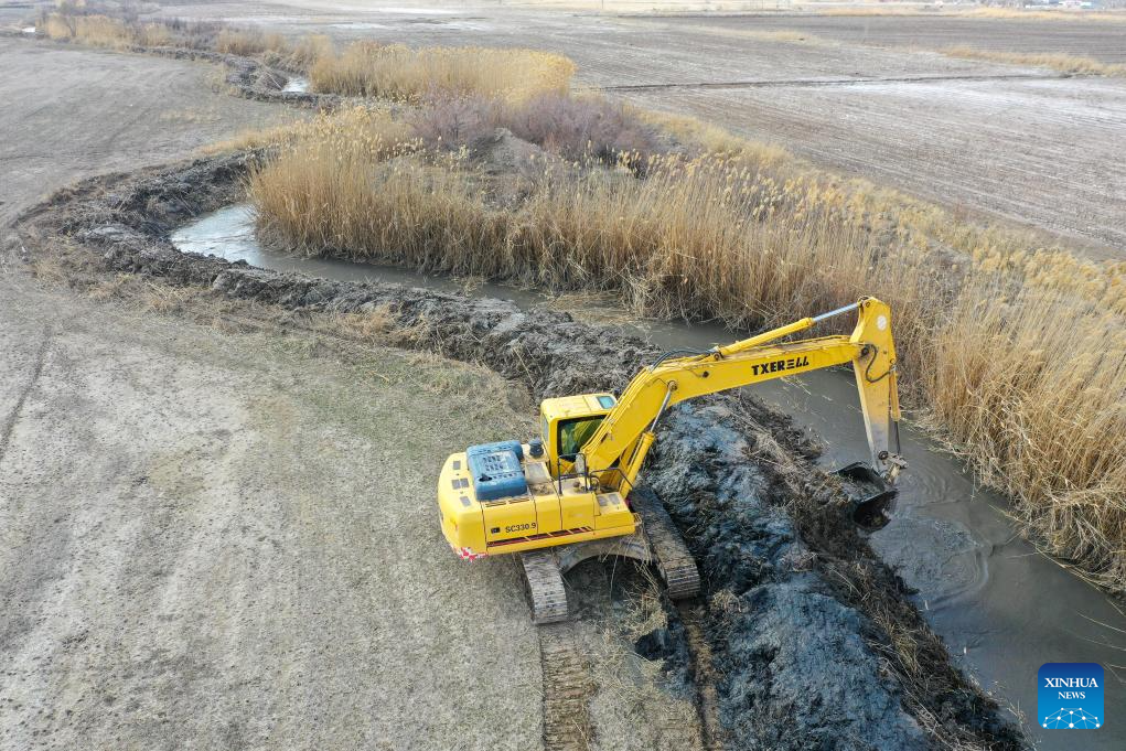 An aerial drone photo taken on March 24, 2026 shows a staff member operating an excavator to dredge a river channel in Qapqal Xibe Autonomous County of Ili Kazak Autonomous Prefecture, northwest China's Xinjiang Uygur Autonomous Region. Recently, in response to the potential flood risks caused by snowmelt in the Tianshan and Altay Mountains, local authorities in Ili have conducted thorough hazard identification and rectification, increased the frequency of meteorological and hydrological monitoring, stockpiled sufficient flood control supplies, and established emergency rescue teams to prevent flood-related disasters during the flood season. (Xinhua/Ding Lei)