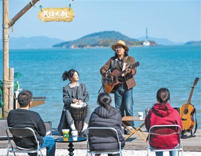 Ma Zhen, owner of a local cafe, performs original folk songs for visitors in Xiashan village, Qiangjiao town, Ninghai county, east China's Zhejiang Province. (Photo courtesy of the interviewee)