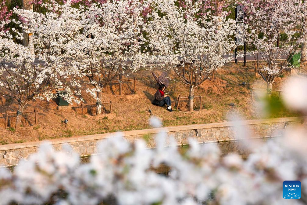 A tourist reads under the blooming cherry trees on the bank of the Liangma River in Beijing, capital of China, April 1, 2026. Many riverbanks in Beijing are dotted with blooming flowers, attracting numerous citizens and tourists to come for sightseeing. (Xinhua/Ju Huanzong)