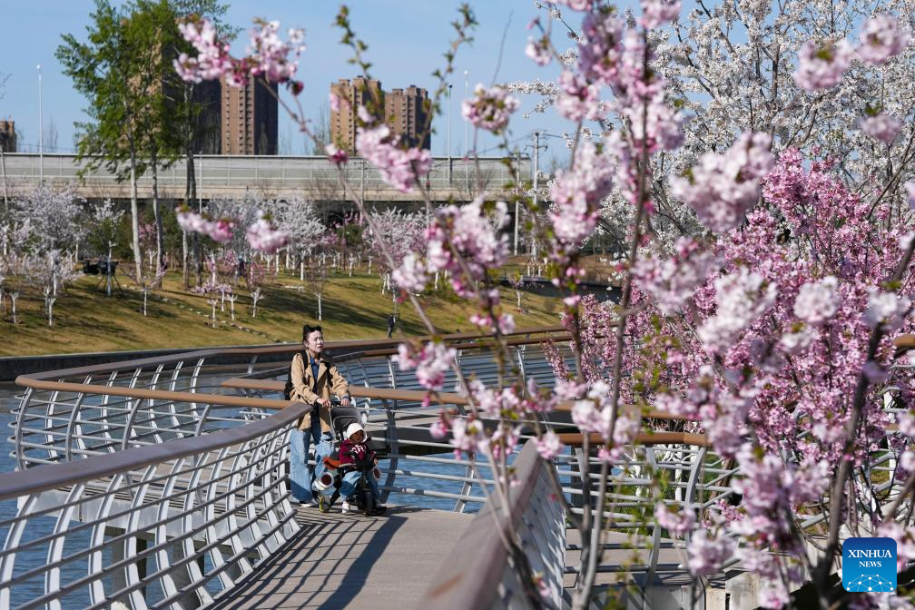 People enjoy spring time along the Liangma River in Beijing, capital of China, April 1, 2026. Many riverbanks in Beijing are dotted with blooming flowers, attracting numerous citizens and tourists to come for sightseeing. (Xinhua/Zhang Chenlin)