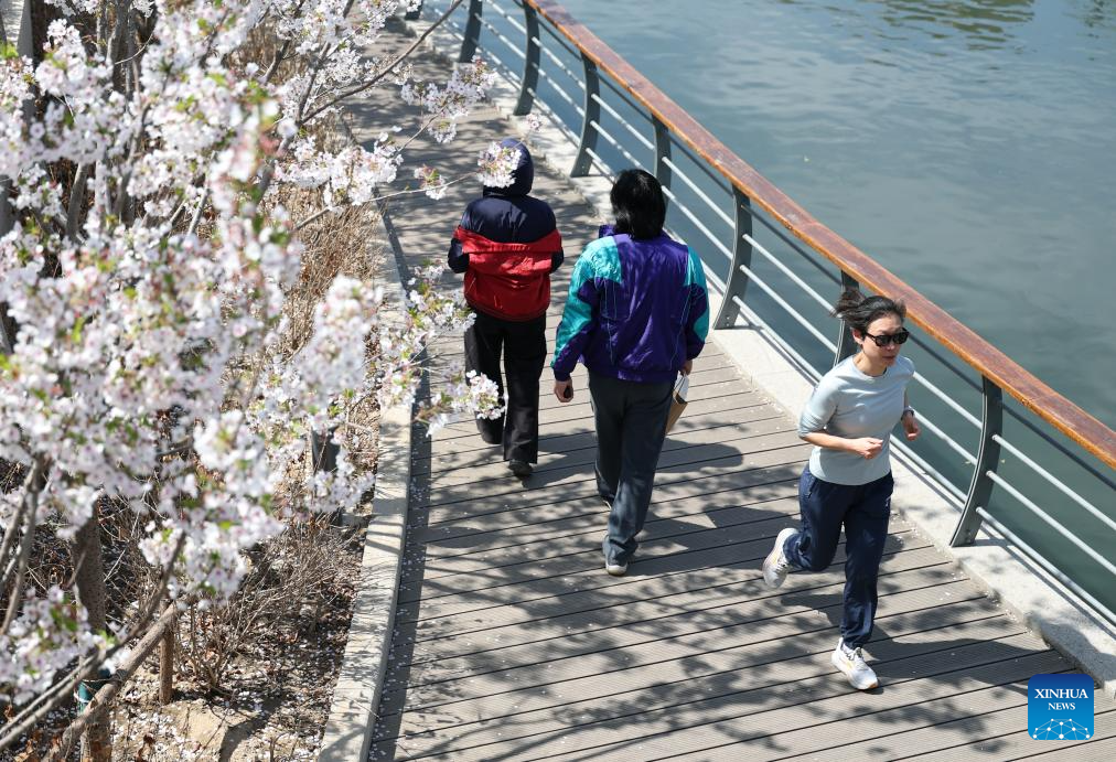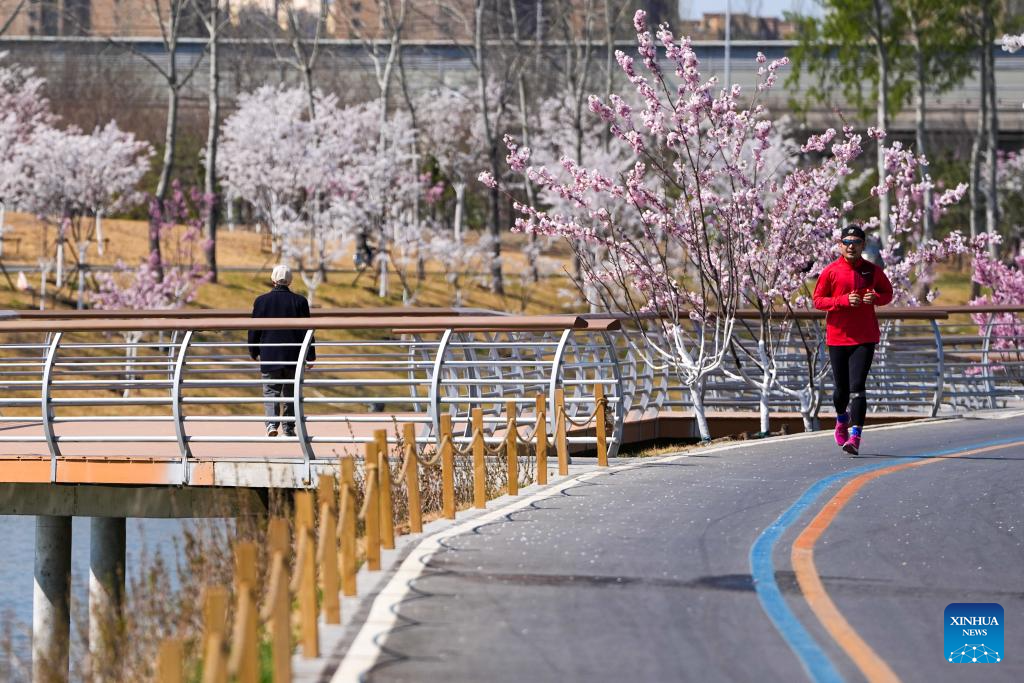 A man jogs on the bank of the Bahe River in Beijing, capital of China, April 1, 2026. Many riverbanks in Beijing are dotted with blooming flowers, attracting numerous citizens and tourists to come for sightseeing. (Xinhua/Ju Huanzong)