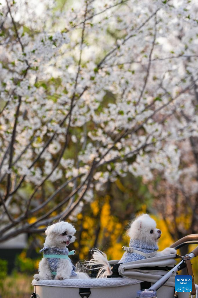 Pet dogs are pictured under blooming cherry trees near the Liangma River in Beijing, capital of China, April 1, 2026. Many riverbanks in Beijing are dotted with blooming flowers, attracting numerous citizens and tourists to come for sightseeing. (Xinhua/Ju Huanzong)