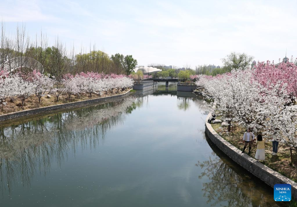 People stroll and have fun along the riverside of the Liangma River in Beijing, capital of China, April 1, 2026. Many riverbanks in Beijing are dotted with blooming flowers, attracting numerous citizens and tourists to come for sightseeing. (Xinhua/Ju Huanzong)