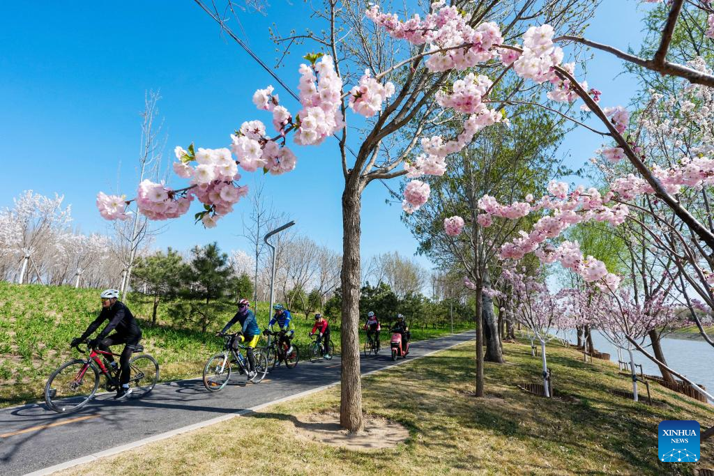 People cycle on the bank of the Bahe River in Beijing, capital of China, April 1, 2026. Many riverbanks in Beijing are dotted with blooming flowers, attracting numerous citizens and tourists to come for sightseeing. (Xinhua/Ju Huanzong)