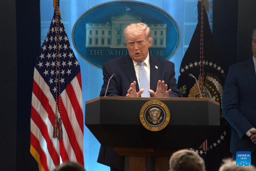 U.S. President Donald Trump speaks during a press conference at the White House in Washington, D.C., the United States, April 6, 2026. Trump said Monday that Iran could be "taken out" in one night and that night "might" be Tuesday evening, the deadline Trump set for Iran to make a deal and reopen the Strait of Hormuz. (Photo by Li Yuanqing/Xinhua)