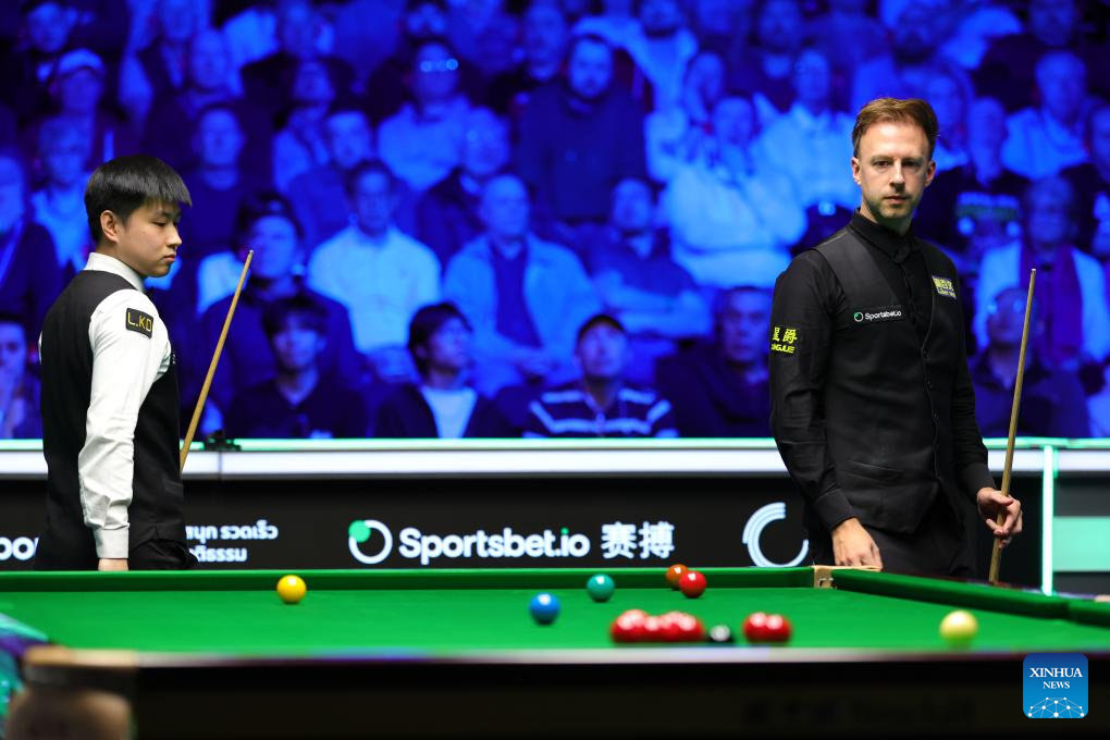 Zhao Xintong (C) of China competes during the final between Zhao Xintong of China and Judd Trump of England at the 2026 Snooker Tour Championship in Manchester, Britain, April 5, 2026. (Photo by Zhai Zheng/Xinhua)