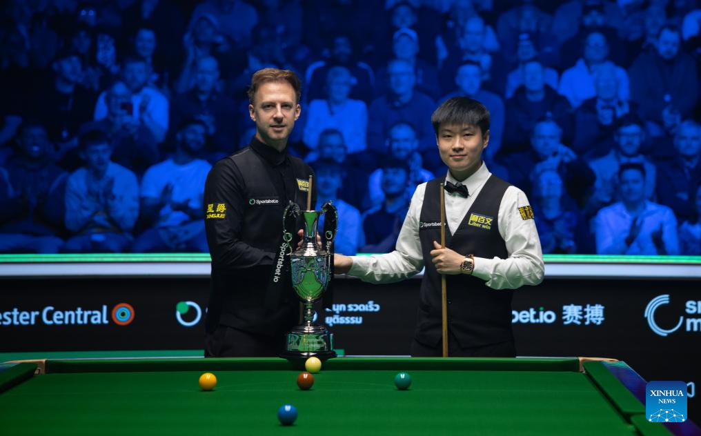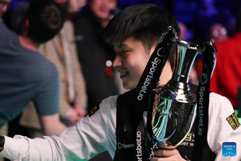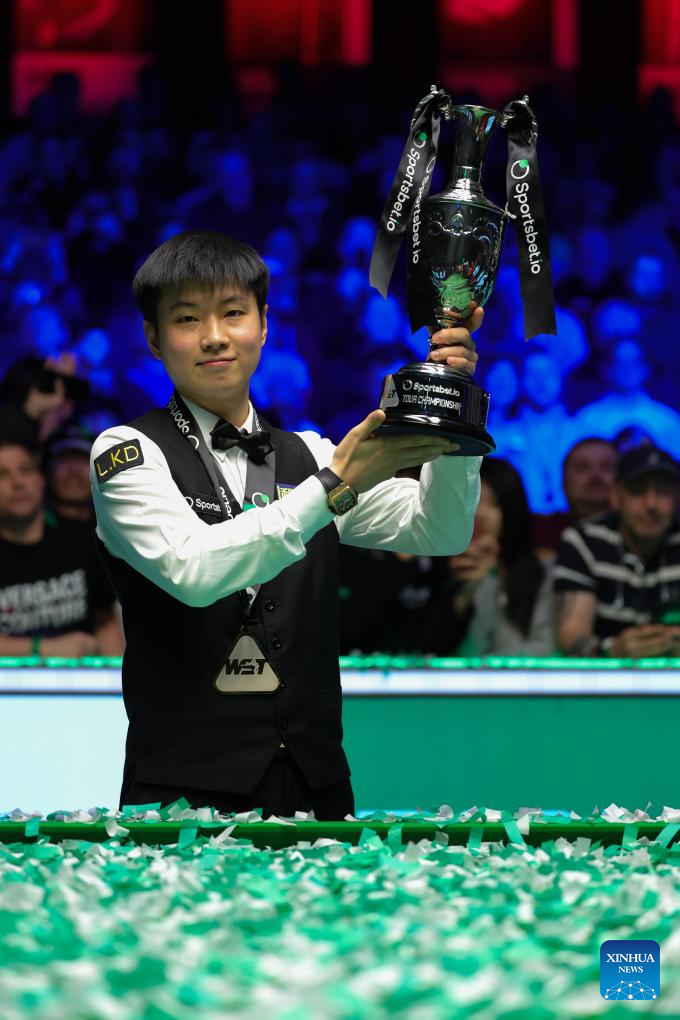 Zhao Xintong of China poses with his trophy during the awarding ceremony after the final between Zhao Xintong of China and Judd Trump of England at the 2026 Snooker Tour Championship in Manchester, Britain, April 5, 2026. (Photo by Zhai Zheng/Xinhua)