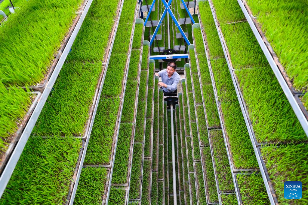 A staff member tends rice seedlings at an intelligent seedling factory in Guangshan County of Xinyang City, central China's Henan Province, April 6, 2026. (Photo by Xie Wanbo/Xinhua)