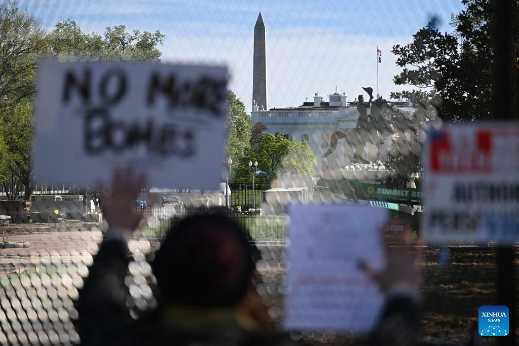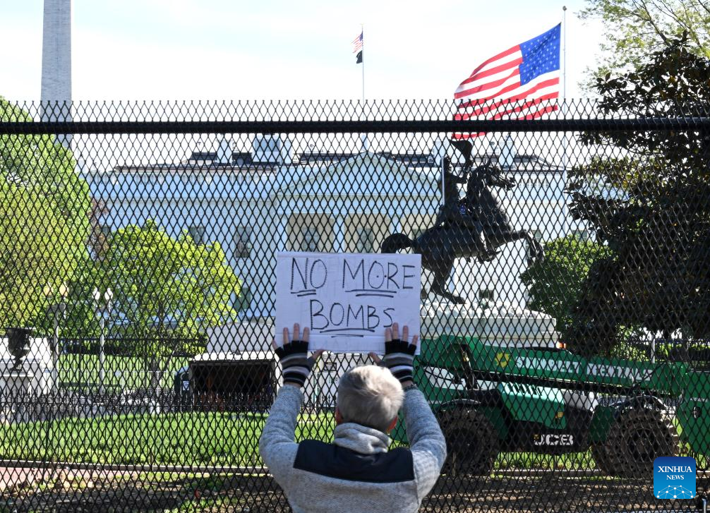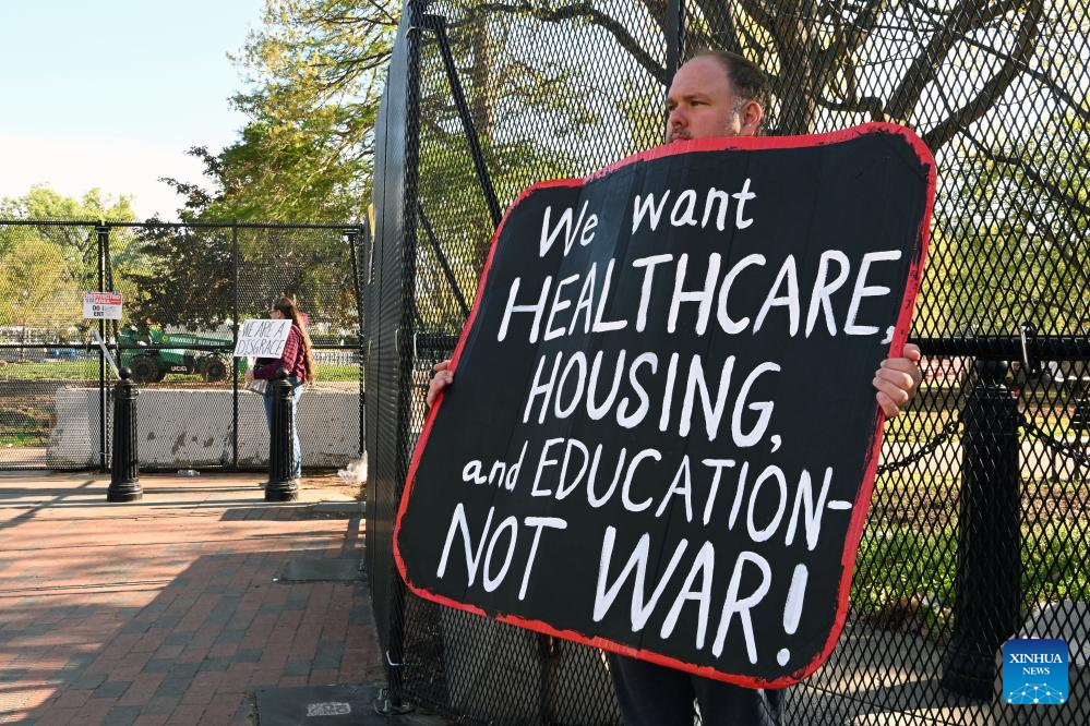 A demonstrator holds placards in front of the White House in Washington, D.C., the United States, on April 7, 2026. (Xinhua/Li Rui)