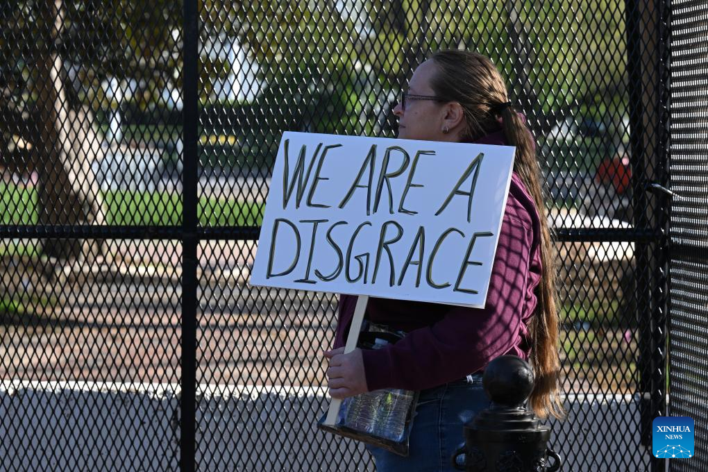 A demonstrator holds a placard in front of the White House in Washington, D.C., the United States, on April 7, 2026. (Xinhua/Li Rui)