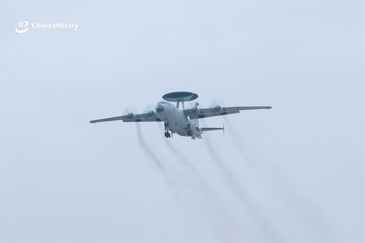 A KJ-500 airborne early warning (AEW) aircraft attached to an aviation unit under the Chinese PLA Navy soars into the sky during an early warning and reconnaissance training exercise in April, 2026. (eng.chinamil.com.cn/Photo by Yang Jian)