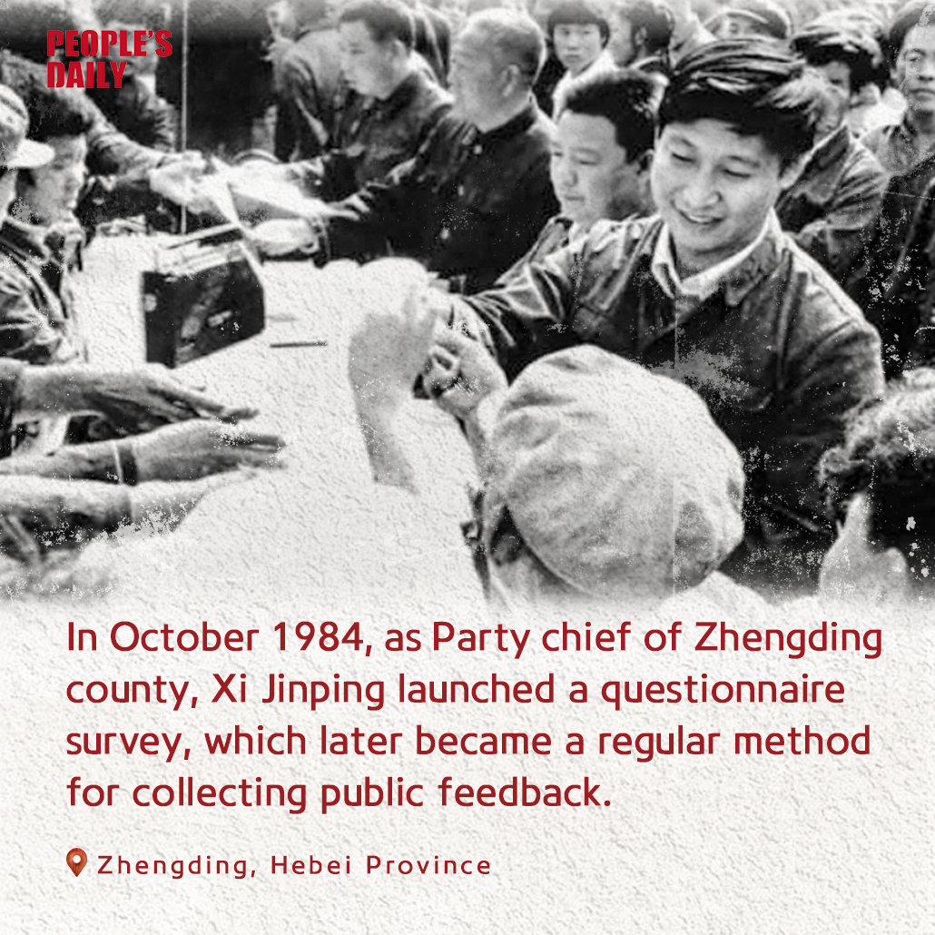 In October 1984, then secretary of the CPC Zhengding County Committee, Xi Jinping led his staff to the main street, set up tables and benches, and distributed public opinion surveys. Investigation and research are treasured traditions of the CPC and fundamental skills for effective governance.