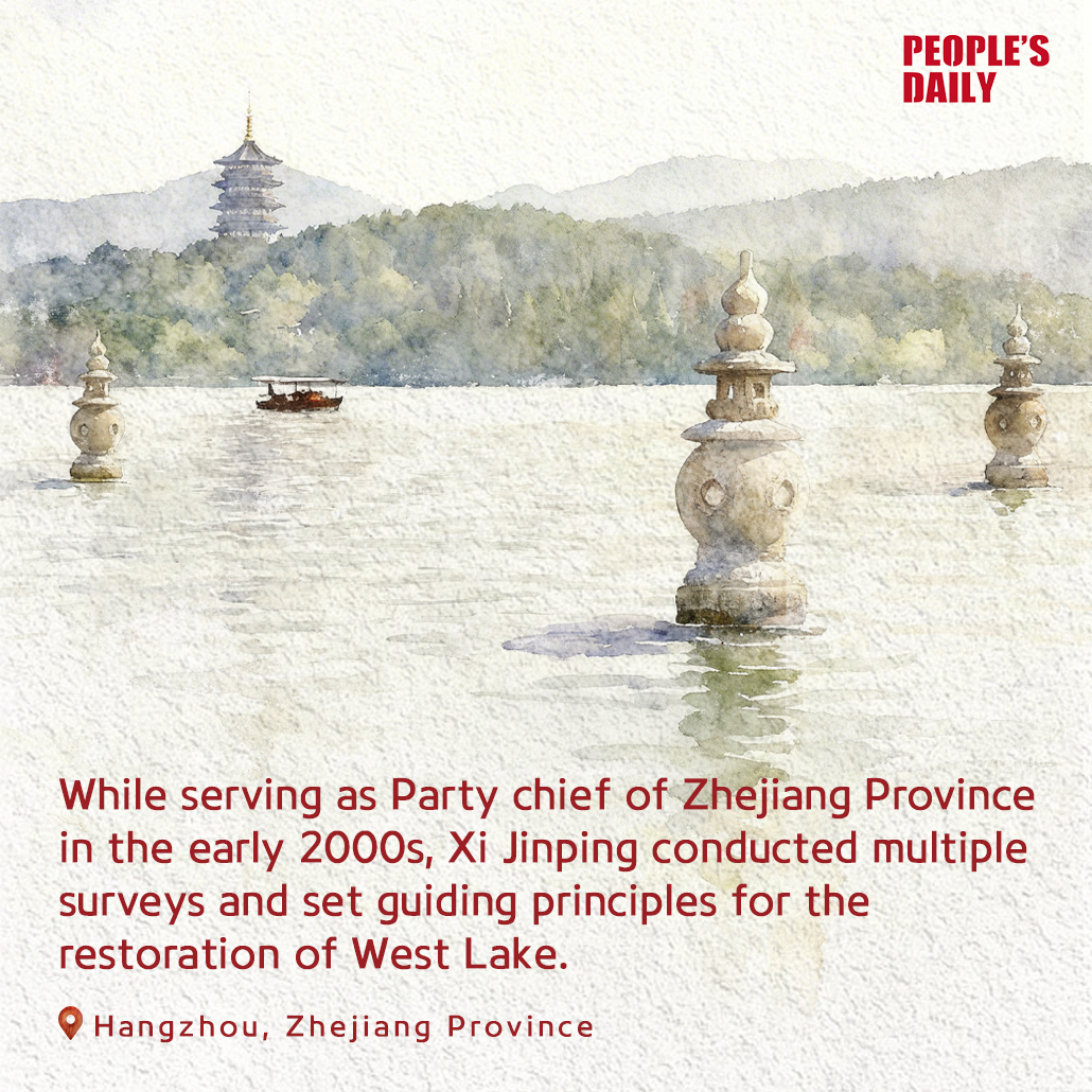In the early 2000s, the West Lake in Hangzhou, Zhejiang Province, faced shrinking water area, deteriorating water quality, damaged landscapes, and encroached public spaces. Xi Jinping, then Party chief of Zhejiang Province, conducted multiple surveys and set principles for its comprehensive restoration. Over 180 historical and cultural sites were restored, and the lake's area gradually recovered.