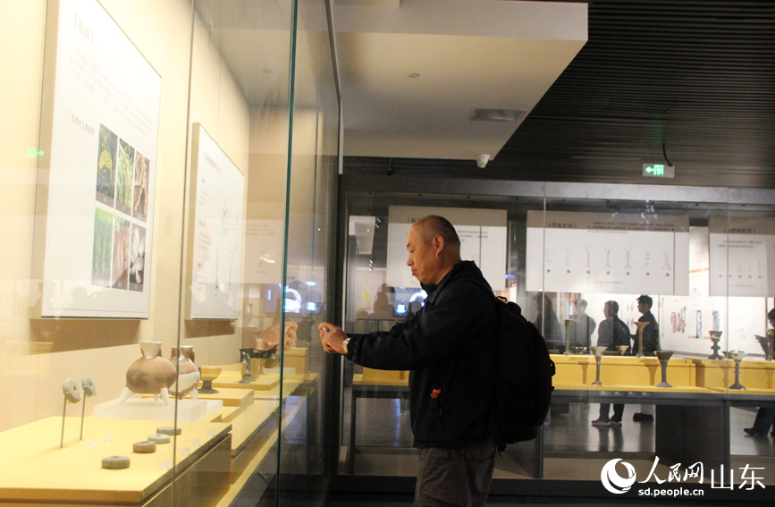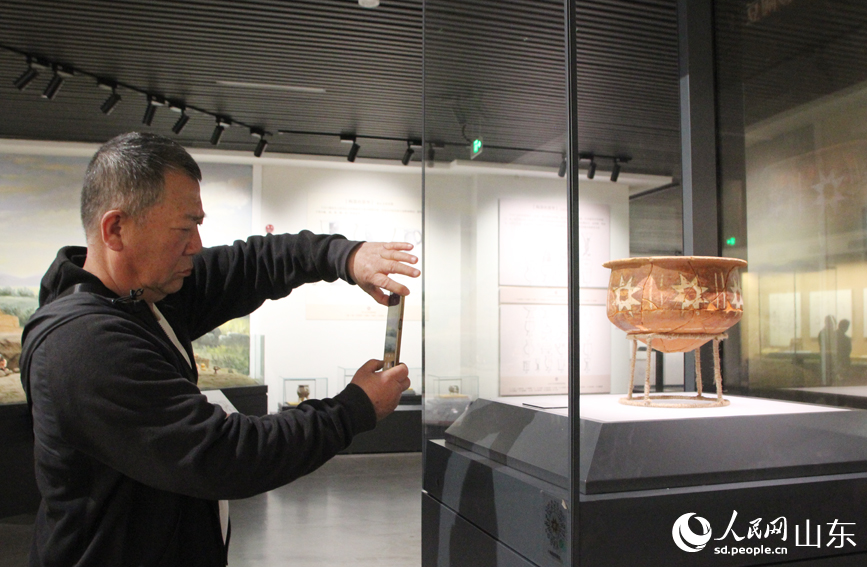 A tourist takes pictures of an artifact at the Dawenkou Site Museum in Dawenkou town, Daiyue district, Tai'an city, east China's Shandong Province. (People's Daily Online/Song Cui)