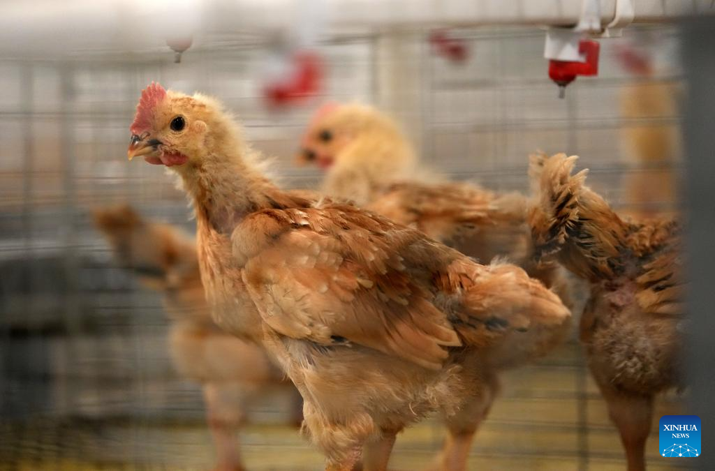 This photo taken on April 9, 2026 shows chicks at a poultry breeding farm with agricultural technology support in Wugong County, northwest China's Shaanxi Province.