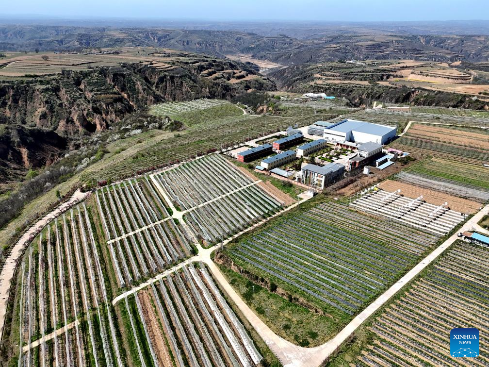 An aerial drone photo taken on April 10, 2026 shows an apple cultivation farm with agricultural technology support in Luochuan County, northwest China's Shaanxi Province.