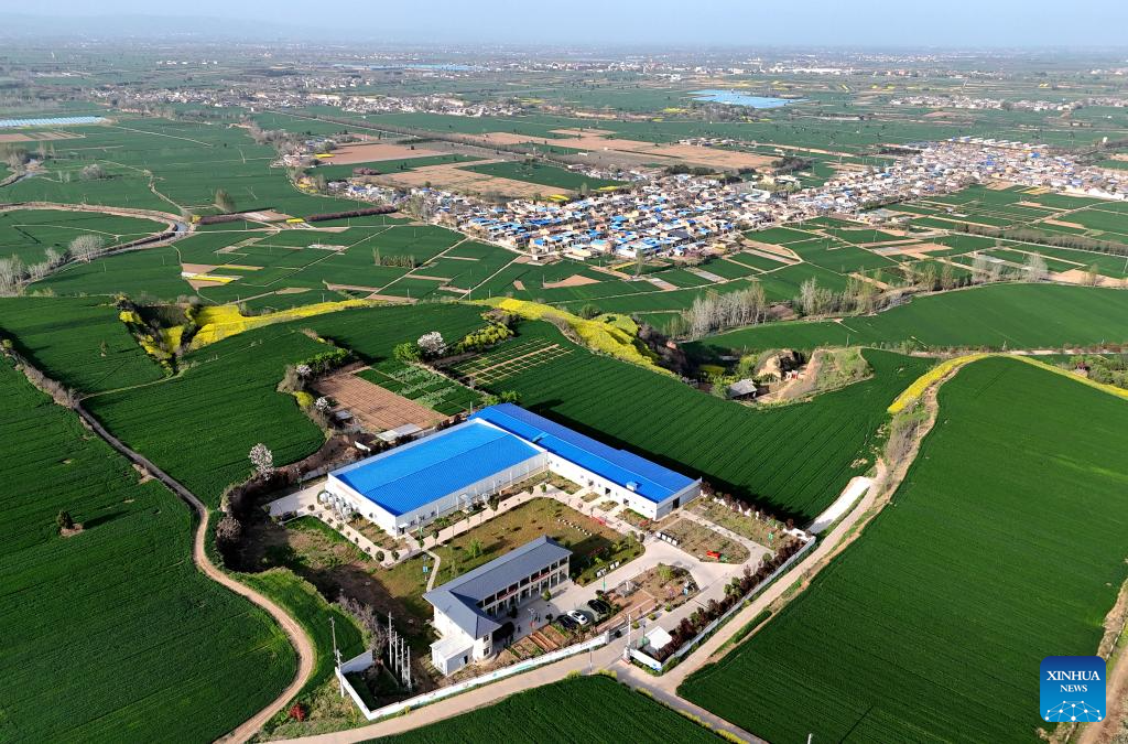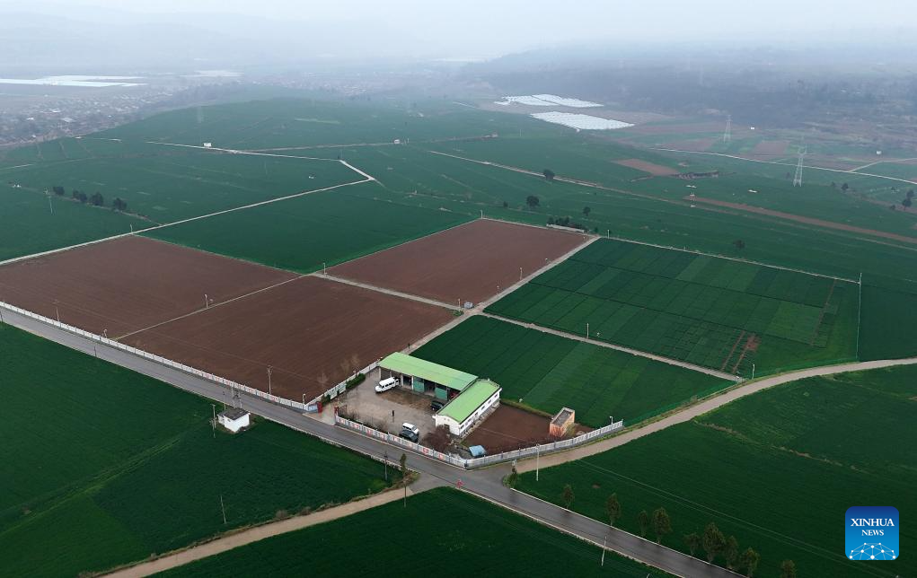 An aerial drone photo taken on April 8, 2026 shows a wheat farm with agricultural technology support in Longxian County, northwest China's Shaanxi Province.