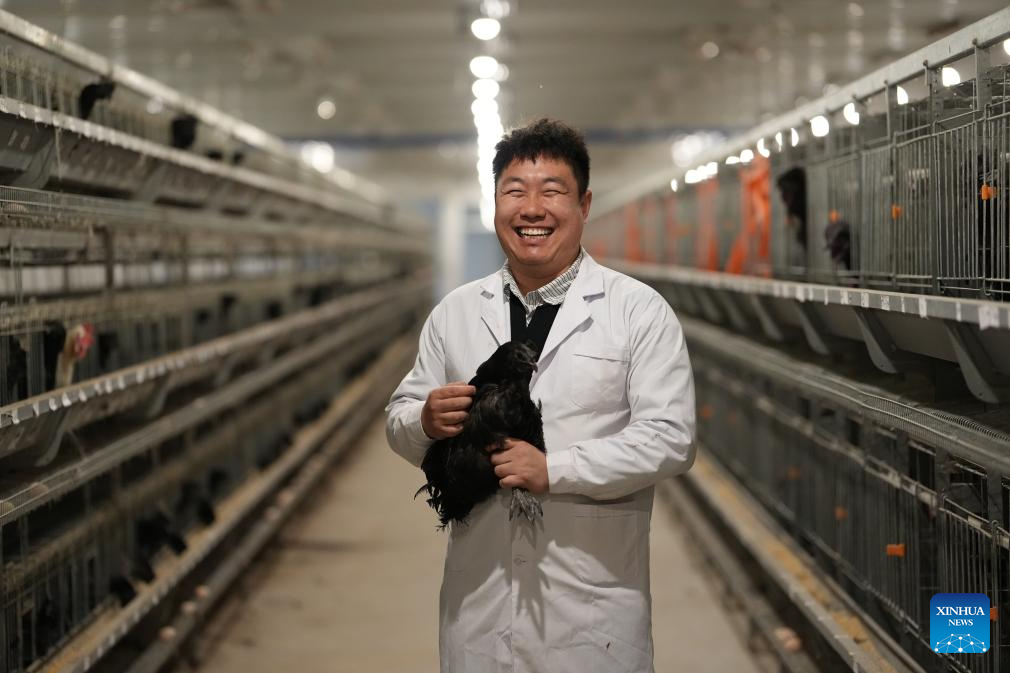 Qin Kailong, a doctoral student from the Northwest A&F University, checks the growth of a black chicken at a poultry breeding farm with agricultural technology support in Wugong County, northwest China's Shaanxi Province, April 9, 2026.