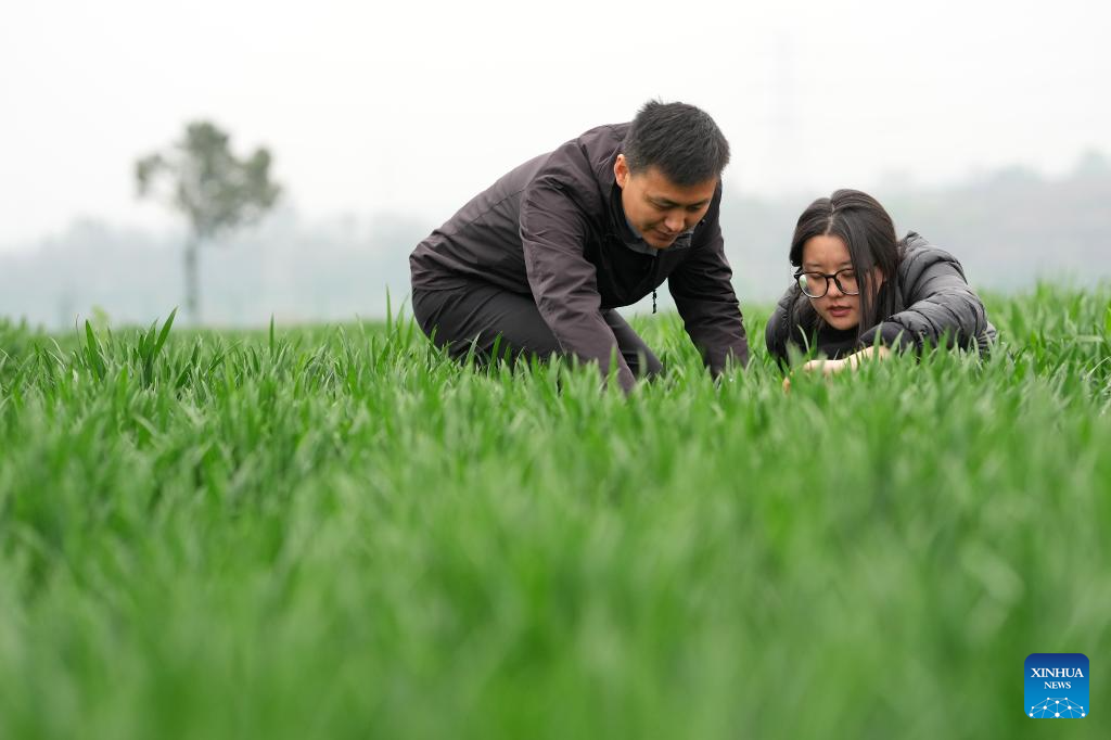 Zhang Chao (L), an associate professor with the Northwest A&F University, checks the growth of wheat with a postgraduate student in a test field in Longxian County, northwest China's Shaanxi Province, April 8, 2026.