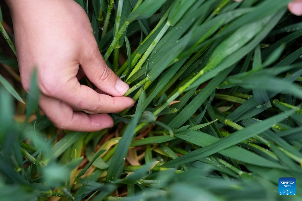 Zhang Chao, an associate professor with the Northwest A&F University, checks pest infestation in a wheat field in Longxian County, northwest China's Shaanxi Province, April 8, 2026.