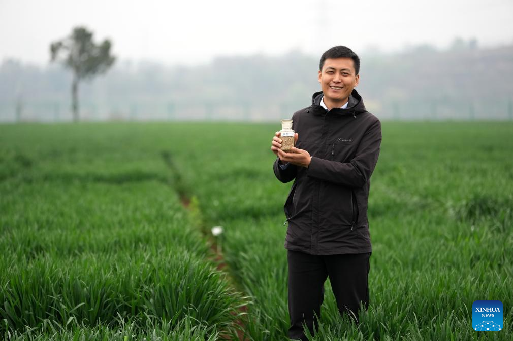 Zhang Chao, an associate professor with the Northwest A&F University, shows wheat seeds in a test field in Longxian County, northwest China's Shaanxi Province, April 8, 2026.